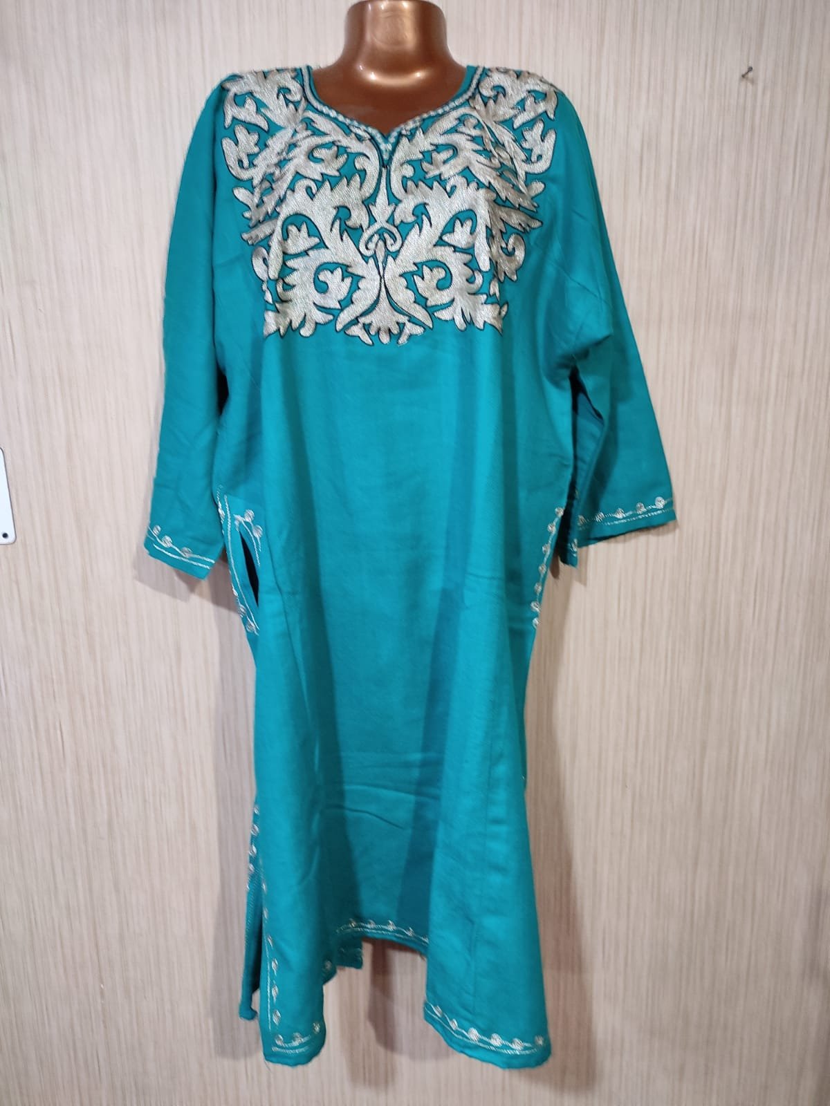 Buy Traditional Ari Work Rafle Kashmiri Pheran at lowest ever Wholesale Price. Raffle Wool Pherans with Tilla Thread work in exquisite Blue Color and Beautiful Tilla Design.
