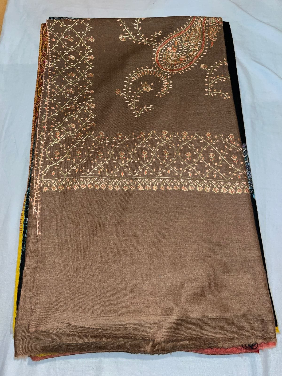 The word Pure Handloom Pashmina literally means soft gold, so precious and expensive this wool is. This sophisticated brown Pure Handloom Pashmina shawl combine this fine Pure Handloom Pashmina with other premium wool to create a piece of clothing so soft, so exquisite that anyone would be lucky to drape it on. It has been further enhanced with intricate floral embroidery that has been done entirely by hand by the skilled craftsmen of Kashmir.