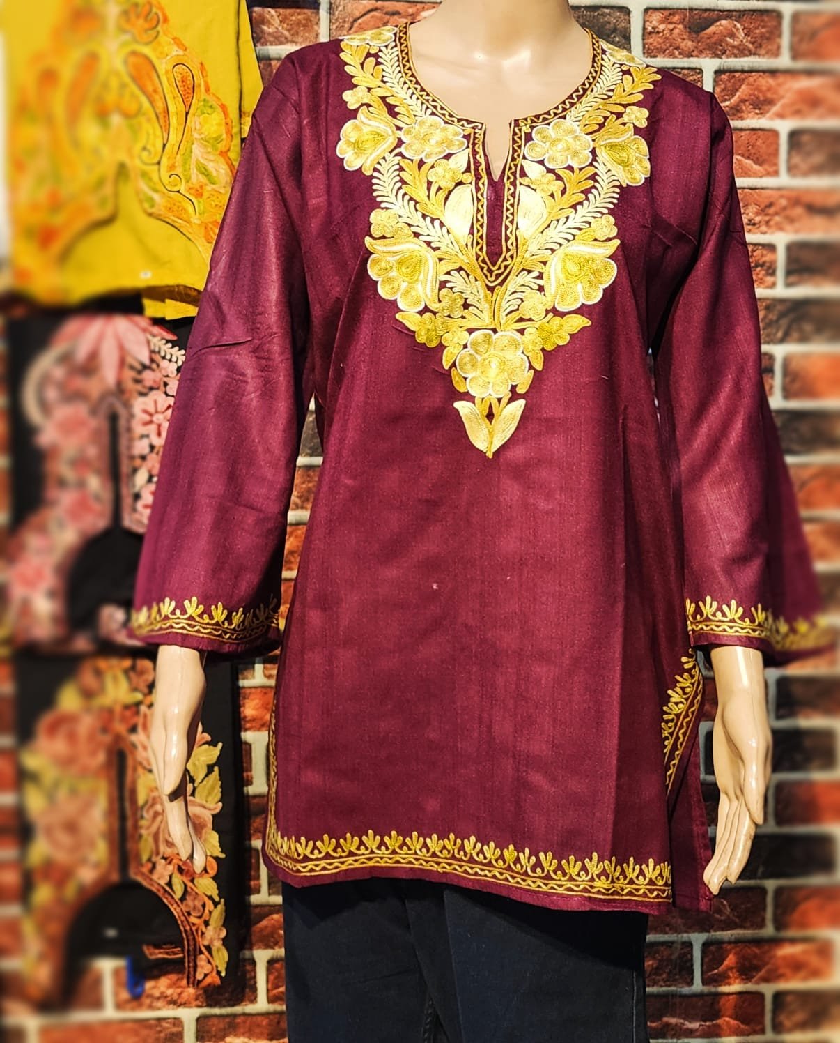 - Kashmiri Aari Embroidery: Each top is meticulously handcrafted with intricate Kashmiri Aari embroidery, showcasing the rich cultural heritage and skilled craftsmanship of Kashmiri artisans. The exquisite floral motifs, paisley patterns, and fine detailing add a touch of opulence and sophistication to your summer look.