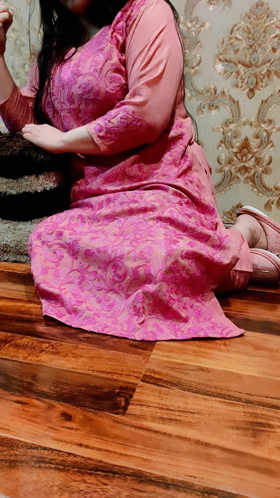 What truly sets this kurta set apart is the intricate Kashmiri Aari work that adorns each piece. The kurta features delicate Aari embroidery, characterized by its fine, chain-stitch patterns that create a rich, textured look. This traditional craftsmanship enhances the aesthetic appeal of the kurta, adding a touch of sophistication and artistry. The pants also feature subtle Aari work, providing a harmonious balance without overwhelming the overall design. The dupatta, with its elegant Aari embroidery, ties the ensemble together, offering versatility in styling.