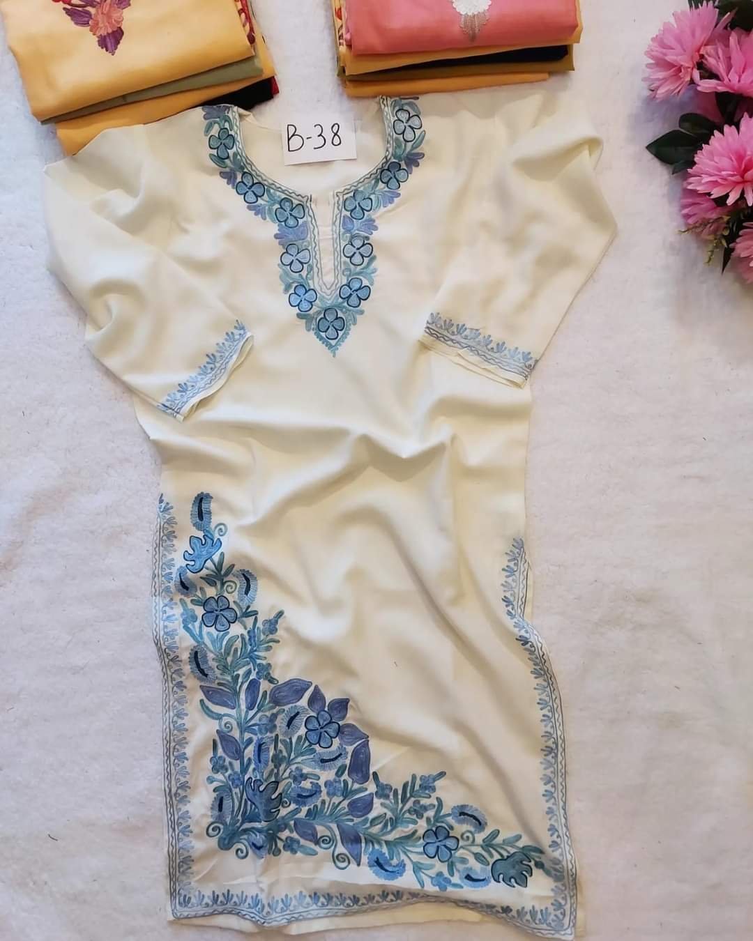 Experience the timeless charm and effortless beauty of our Gorgeous Kashmiri Ari work embroidered kurtas, designed to elevate your summer style with grace and flair.