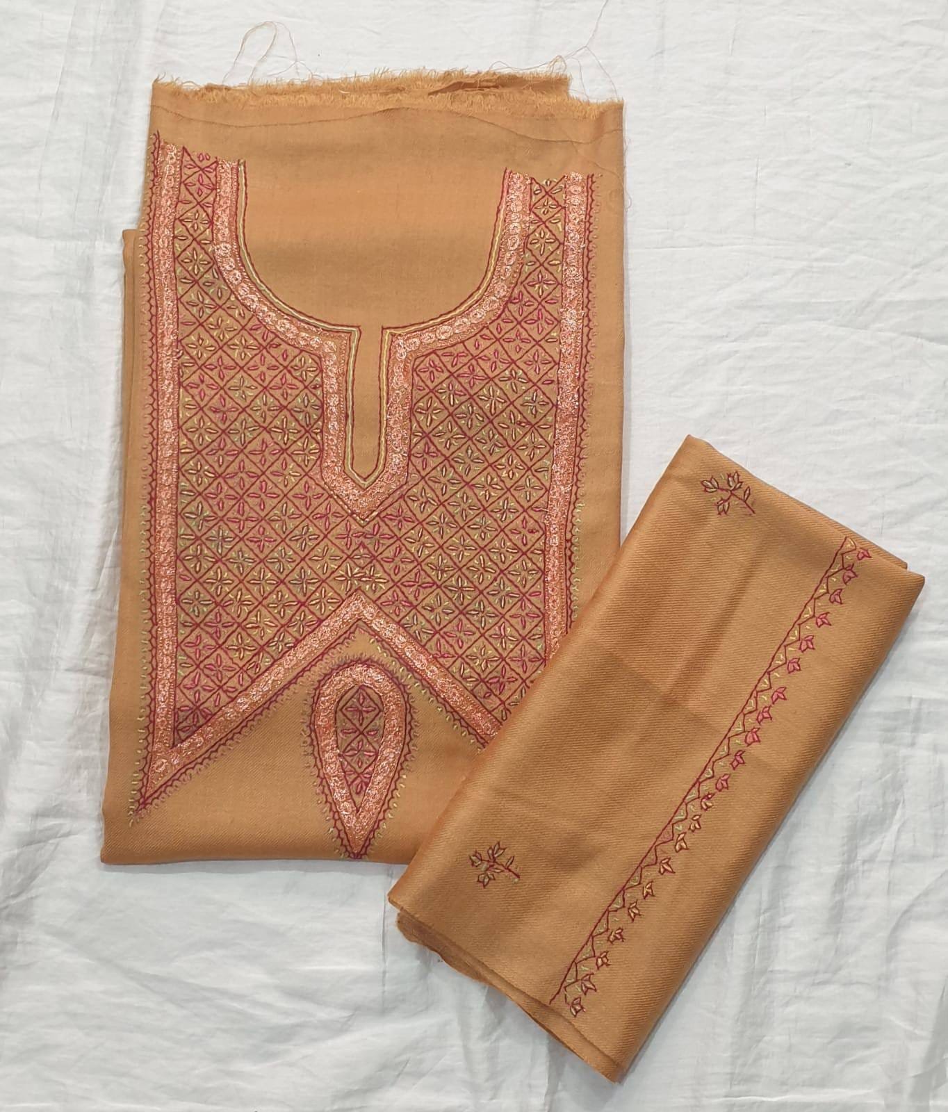 The suit is adorned with Sonzi embroidery, a hallmark of Kashmiri craftsmanship. The meticulous threadwork, known for its intricate patterns, adds a subtle touch of luxury and refinement to the outfit.