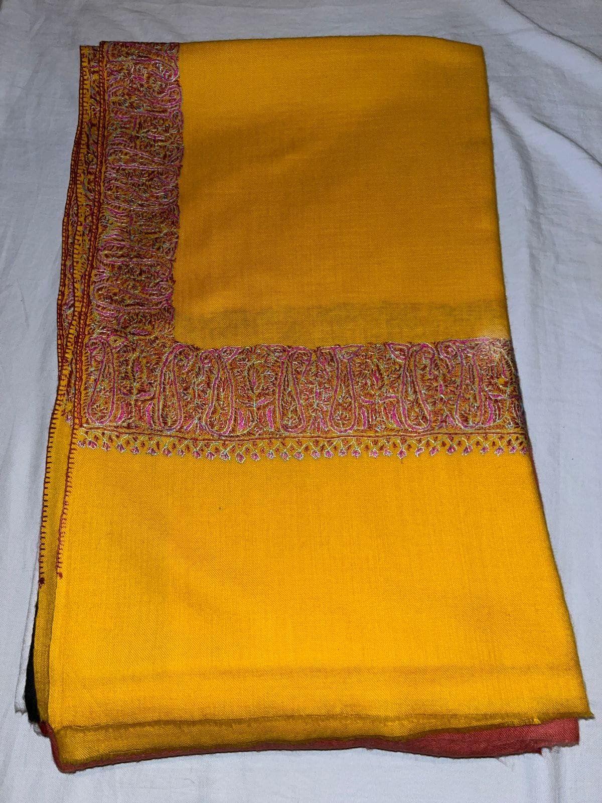 Yellow Semi Pashmina Kashmiri Shawl, Doordaar Embroidery Work