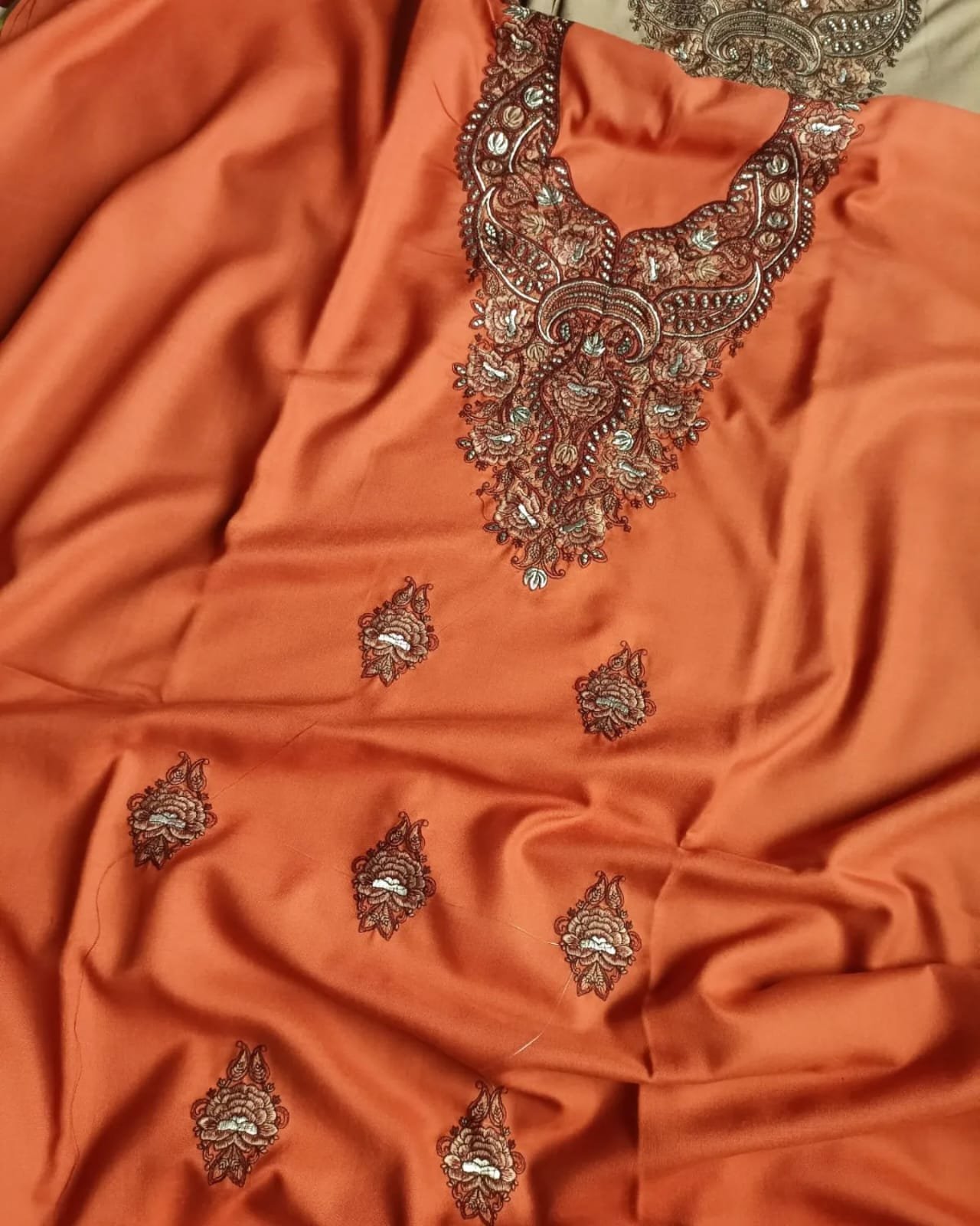 - Exquisite Sozni Embroidery: Each suit is adorned with intricate Sozni embroidery, a traditional Kashmiri hand embroidery technique known for its exquisite beauty and fine detailing.