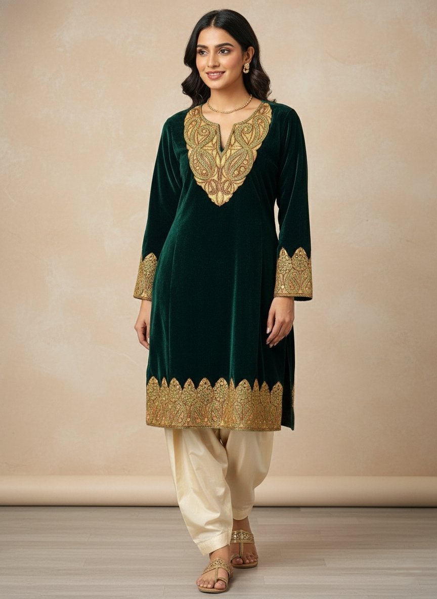 This stunning garment is a Kashmiri Pheran, a traditional loose-fitting tunic from the Kashmir Valley, specifically designed for bridal or formal wear.